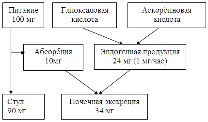 Баланс оксалата достигается благодаря почечной экскреции — 15 — 40 мг/день. Щавелевую кислоту сыворотки крови можно разделить на экзогенную, которая поступает в организм в результате абсорбции из ЖКТ (30 %) и эндогенную, которая является продуктом метаболизма (70 %).